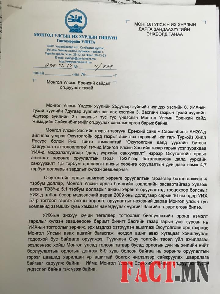 УИХ-ын гишүүн Г.Уянгын хүсэл биелэж Ерөнхий сайдыг огцруулах бичгээ өргөн барилаа