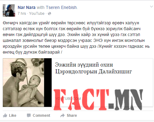 Охиноо нас барсны хэдхэн өдрийн дараа энэ постыг инээсэн зурагтай нь тавьж байсан. Тэр пост алга болж …би хайгаад олсонгуй…Миний ФБээс олон зураг алга болж байгаач хаагдахгуй байгаа…Гайхмаар юм их болохнээ…Өнөөдөр Мүүнийхэн миний тэнгэрт хальсан охиноор намайг давшлав… Намайг элдэвлэ…хүссэнээрээ доромжил…харин миний охиныг тайван оpхи…Uugantsetseg Gantumur дүү хадгалчихаж…Маш их баярлалаа….2016.03.16