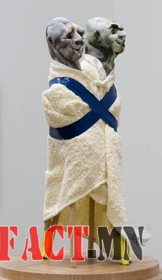 “ХХ зууны сор бүтээл” хэмээн үнэлэгдсэн энэ ажлыг 1993-1994 онд хийсэн юм. Урлагийн түүхийг зуун зуунаар ярьдаг тул хориод жилийн өмнөх гэдэг нь бараг саяхных гэсэн үг. Бүтээгч нь Томас Шютте, 1954 онд Германд төржээ. Хуванцар, мод, шил, нүүр гарын алчуур, баримлын шавраас төрсөн энэ хоёр “нөхөр” одоо Лондоны Тейт галерейд хадгалагдаж буй бөгөөд перформанс уран баримал, орчин үеийн примитив уран баримал хэмээх төрөлд хамаарагдана. Хооронд нь холбон, хүлсэн хоёрыг “Хэлхэлдсэн дайснууд” хэмээн нэрлэжээ. Тэд дэндүү айдастай, бачимдуу харагдан, эвгүйцэн жихүүцэх сэтгэгдэл төрүүлнэ. Хүүхдүүдийн тоглодог фимо хэмээх ердийн баримлын шавраар тэднийг урласан юм. Алчуур, даавуун уяагаар баглан хулдаж, саваагаар хөл хийсэн нь дүрүүдийг өрөвдмөөр, арчаагүй, дорой харагдуулна. Шаналалд автсан царай зүс, эвлэршгүй хоёр дайсныг бие биеэс нь салахааргүй болтол холбож хэлхсэн зэргээрээ зураач “Хүмүүс ямар ч аргагүй байдлаар л нийгмийн хууль дүрэмд ийн захирагддаг” хэмээн хэлэхийг хүсчээ. “Хэлхэлдсэн дайснууд”-ын олон хувилбар бий. Ер нь Шуттед иймэрхүү, санаанд багтамгүй хачин зохиомол дүрсүүд, түгшүүр, дарамтат байдлыг үзүүлсэн ажлууд их бий.