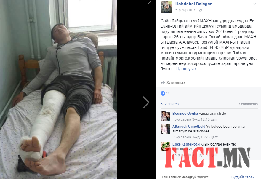 Гэвч түүний хөлийг Баян-Өлгий аймагт эмчлэх боломжгүй, хот ру яв гэсэн ч МАХН-ын дарга нар нэгч төгрөг өгөөгүй ажээ. Онгоцоор явах гэтэл 1’200.000 төгрөгийн зардалтай байсан тул 2000км газарт автобусаар явахаар болсон байна. Тухайн үед дээрх дарга нар намын үйл ажиллагаагаар хурал,семинар хийж явсан аж. Тиймээс хохирогч залуу МАХН-ын дарга Н.Энхбаяраас фэйсбүүкээрээ дамжуулан тусламж хүсчээ.