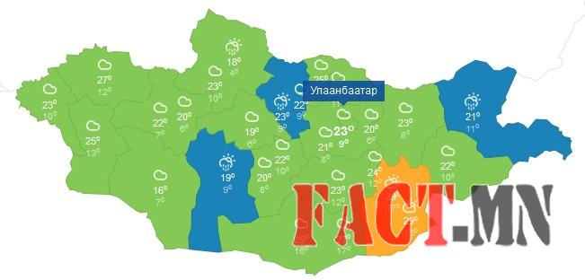 УЛААНБААТАР ХОТ: Үүлшинэ. Бороо орохгүй. Салхи баруун өмнөөс хойш эргэж секундэд 5-10 метр, зарим үед секундэд 14-16 метр хүрч шороон шуурга шуурна. 21-23 хэм дулаан байна.