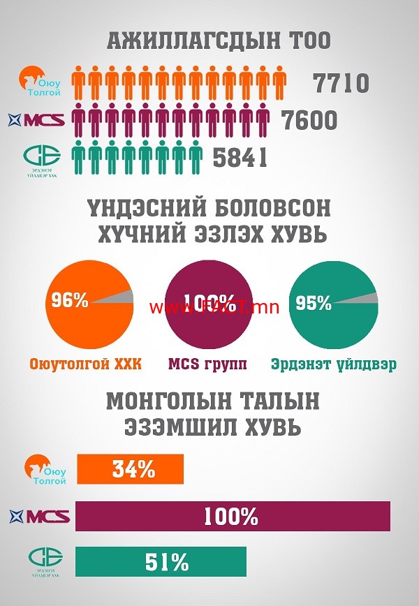 Эхний жишээ. Сүүлийн жилүүдэд гадаадаас хамгийн том хөрөнгө оруулалт татсан Оюутолгой компанид 7700 орчим хүн ажилладаг. Ажиллагсдын 96 хувь нь үндэсний боловсон хүчин гэж тус компанийн албан ёсны вэб сайтад бичжээ. Монголын талын эзэмшил 34 хувь. Ийм сайн үзүүлэлттэй Оюутолгой үндэсний компани мөн үү?