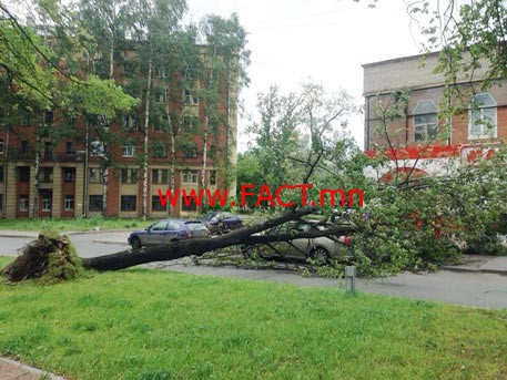 Санкт-Петербург хотод салхины хүч секундэд 20 метр хүрч, хүчтэй салхилснаас ургаа моднууд олноороо унасан тухай РИА Новости тус хотын Онцгой байдлын газрын эх сурвалжаас иш татан мэдээлсэн байна.