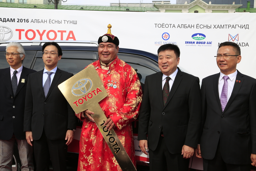 Уулзалтын дараа Тулгар төрийн 2225, Их Монгол Улсын 810, Ардын хувьсгалын 95 жилийн ой үндэсний их баяр наадмын үндэсний бөхийн барилдаанд 10 даван түрүүлсэн Монгол Улсын Аварга Ч.Санжаадамбад “Тоyoтa мотор” корпорациас “Ланд крузер-200” авто машиныг гардуулан өгөх ёслолын ажиллагаа боллоо. Энэхүү арга хэмжээнд нийслэлийн ИТХ-ын дарга Ц.Сандуй, нийслэлийн Засаг дарга бөгөөд Улаанбаатар хотын Захирагч, Үндэсний их баяр наадмыг зохион байгуулах хорооны дарга, С.Батболд нар оролцож, түрүүлсэн бөхөд баяр хүргэлээ гэж Нийслэлийн ЗДТГ-ын Хэвлэл мэдээлэл, олон нийттэй харилцах хэлтсээс мэдээллээ.
