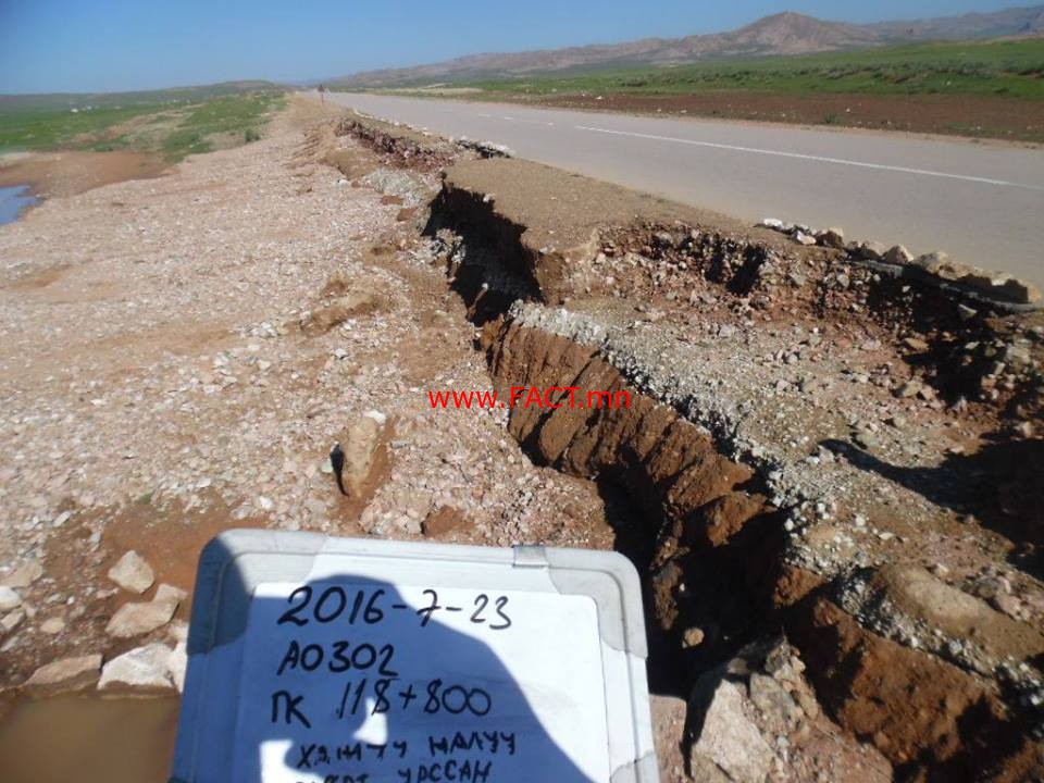 Арвайхээр-Баянхонгор чиглэлийн А0302 дугаартай улсын чанартай хатуу хучилттай автозамд аадар борооны улмаас замын хөвөө шуудуу үерт урсаж эвдэрсэн байна.