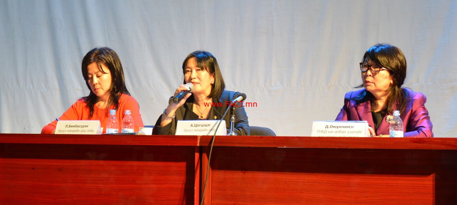 Уулзалтыг нээж Эрүүл мэндийн сайд, Анагаах ухааны доктор А.Цогцэцэг хэлсэн үгэндээ “Салбарын эрх зүйн орчин шинэчлэгдэж, УИХ-аас 2016 онд баталсан “Эмнэлгийн тусламж, үйлчилгээний тухай хууль”, “Эрүүл мэндийн тухай хуульд нэмэлт, өөрчлөлт оруулах тухай хууль”, “Эрүүл ахуйн тухай хууль” –уудыг бид хамтдаа үр дүнтэй хэрэгжүүлэх цаг үе ирээд байна. Эдгээр хуулийн хүрээнд эмнэлгийн тусламж, үйлчилгээний тасралтгүй байдлыг хангах зорилгоор түргэн тусламжийн, сувилахуйн, сэргээн засахын болон хөнгөвчлөхийн тусламж үйлчилгээний нэр төрөл, хүртээмжийг хувийн хэвшлийн оролцоотойгоор нэмэгдүүлэх, эрүүл аюулгүй орчинг бүрдүүлэх, эмнэлгийн засаглалыг хагас бие даасан хэлбэрт шилжүүлэх  зэрэг чухал ажлууд бидний өмнө байна. Мөн анхан шатны эрүүл мэндийн байгууллагад үзүүлэх тусламж үйлчилгээний нэр төрлийг нэмэгдүүлэх, өрхийн анагаах ухаанаар мэргэшсэн хүний нөөцийг бэлтгэж хангах, санхүүжилтийн эх үүсвэрийг нэмэгдүүлэх, иргэн эмчээ сонгон үйлчлүүлэх зэрэг эрх зүйн орчны шинэчлэл хийгдсэн. Одоо бидэнд энэ чиглэлд хийгдэх ажлууд хүлээгдэж байна. Эмнэлгийн тусламж, үйлчилгээг мэргэшсэн эмч, эмнэлгийн мэргэжилтнээр үзүүлэх, тусламж, үйлчилгээний чанарт дэвшил гаргах зорилгоор төгсөлтийн дараах сургалтын тогтолцоонд шинэчлэлт хийж,  чанарыг сайжруулахад сургалт эрхлэгч байгууллагуудын оролцоо, хариуцлагыг  нэмэгдүүлж ажиллахыг ч онцоллоо”.