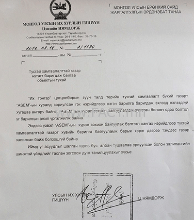 УИХ-ын гишүүн Ц.Нямдорж Ерөнхий сайд Ж.Эрдэнэбатад Тусгай хамгаалалттай газар нутагт баригдаж байгаа обьектын талаарх албан бичгийг хүргүүллээ. Уг албан бичигт, “Их Тэнгэр цогцолборын зүүн талд төрийн тусгай хамгаалалт бүхий газарт “АСЕМ”-ын хуралд зориулсан гэх нэрийдлээр нэгэн барилга баригдаж эхлээд нэлээдгүй хугацаа өнгөрч байна. “АСЕМ”-ын хурал зохион байгуулагдаж дууссан боловч одоо болтол уг барилгын ажил үргэлжилж байна.