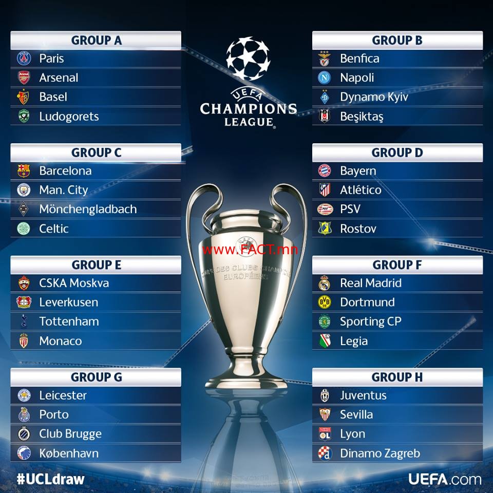 Аваргуудын лигт анх удаа оролцох гэж буй Лэйстер сити клуб G хэсэгт Порто, Клуб Бруг, Копегаген клубүүдтэй тоглохоор болсон байна. Тэгвэл Е хэсэг “алтан дундаж”-уудын хэсэг хэмээн нэрлэгдэж байгаа аж. Тус хэсэгт ЦСКА Москва, Ливеркузен, Тоттенхэм, Монако клубүүд багтжээ.