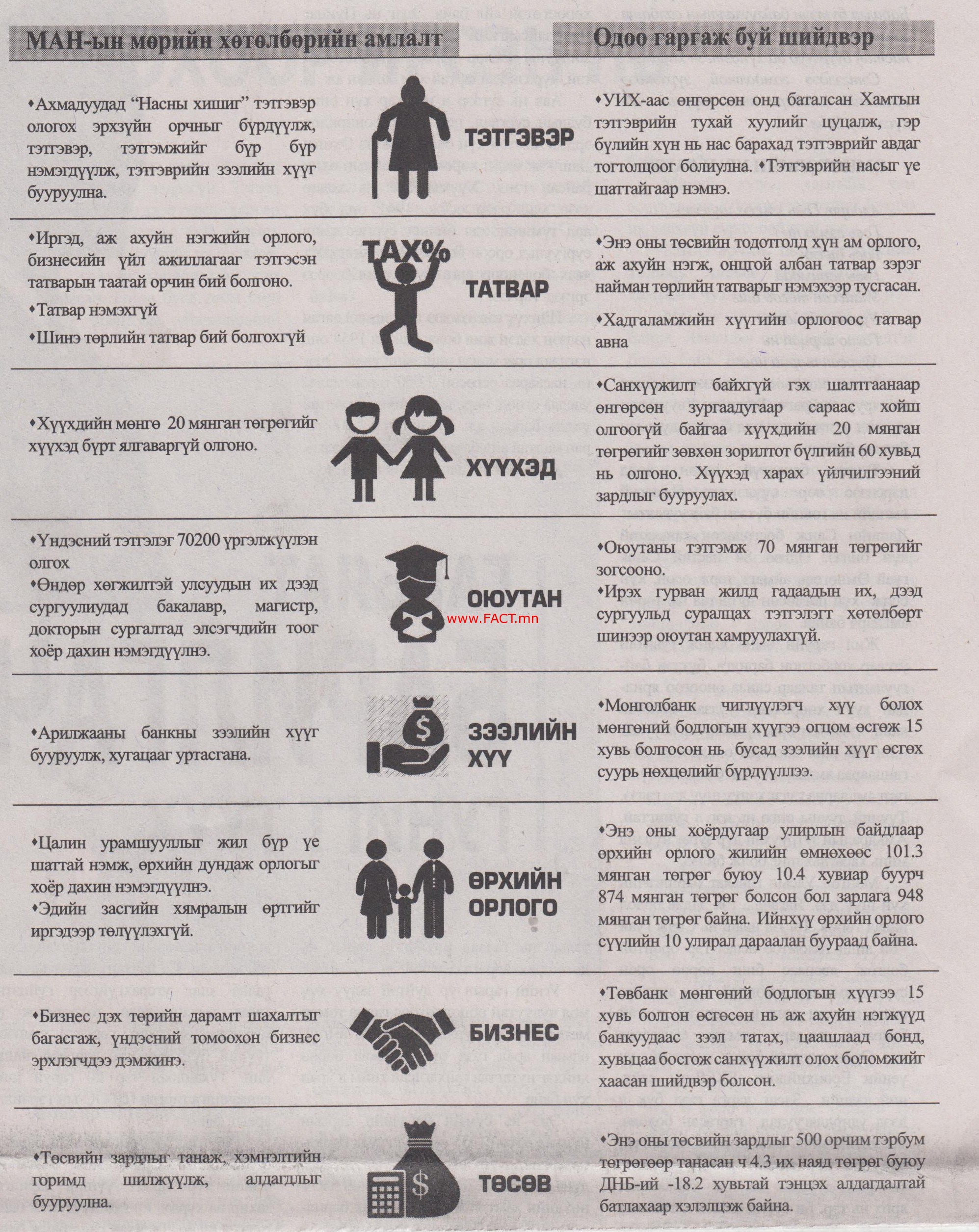 Сангийн яамнаас энэ оны төсвийн тодотгол, 2017, 2018 оны төсвийн хүрээний мэдэгдлийг өргөн барихад дээрх амлалтуудын ихэнх нь эсрэгээрээ иргэдийн халаас руу хэт өнгийсөн нь олон нийтийн бухимдлыг төрүүлээд буй. Нэгэнт эдийн засаг дахь мөнгөний эргэлт буурч, төсвийн орлого 4.3 их наядаар тасарч 2.7 их наяд төгрөгөөр сох дутаад байгаа энэ үед төрийн байгууллагуудын урсгал зардлыг бууруулж, өндөр албан тушаалтнуудын цалинг багасгах зэрэг нь төсвийн үргүй зардлыг бууруулж буй шийдэл гэж хэлж болно. Түүнчлэн хүүхдийн мөнгө, оюутны 70 мянган төгрөг, оюутны тээврийн зардлыг 50 хувийг хасах зэрэг халамжийн шинжтэй хөтөлбөрийг зогсоож байгааг буруутгах боломжгүй. Харин иргэдийн нийгмийн даатгалын шимтгэл, аж ахуйн нэгжийн орлогын бусад татварыг нэмэх шийдвэр гаргавал иргэдэд том дарамт болж очно. Ядуурал руу улам түлхэж, туйлдуулах билээ. Манай улсад бүртгэлтэй 13 мянган компанийн 66 мянга нь энэ оны эхний хагас жилийн байддаар үүдээ барьж, өрхийн орлого нь 10 улирал дарааллан буурч, ажилгүйдэл 10.4 хувьтай байгаа зэрэг үзүүлэлт хямрал өрх, иргэдийг хэрхэн туйлдуулж буйг илтгэх тоо. МАН-ын сонгуулийн мөрийн хөтөлбөрийн амлалт ба одоо гаргаж буй эдийн засгийн томоохон шийдвэрүүдийг дор харьцуулан хүргэж байна.