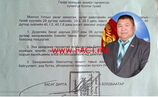 Орон нутгийн сонгууль дөхөж, албан тушаалаасаа удахгүй буух нь тодорхой болсон Налайх дүүргийн Засаг дарга Х.Болдбаатар 8 сарын .. өдөр иргэдэд газар олгох захирамжинд гарын үсэг зуржээ.