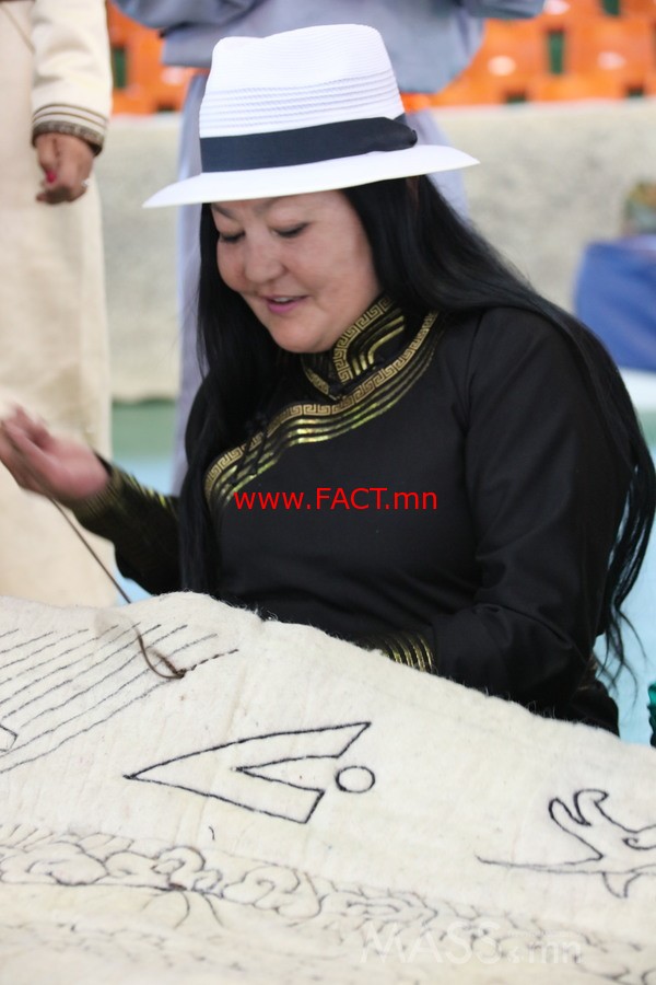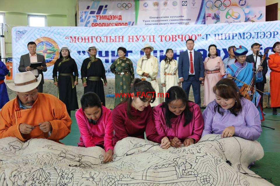 Өнө эртнээс уламжлагдан ирсэн өв соёлоо хадгалан хамгаалж, сурталчилж, үр хойчдоо өвлүүлж, дэлхийд ганцхан Монголынх гэж тамгалуулах 108 метр эсгий ширмэл бүтээлийг одоогоос жил орчмын өмнө Хан Хэнтийн баялаг бүтээгч Нэргүй, гэргий Нарантуяагийн хамтаар санаачлан эхэлж байлаа. Энэ ажил маш том зорилготой. Энэ түүхэн бүтээлийг Юнескод бүртгүүлэх, Гиннесийн дээд амжилт тогтоож бас нэгэн шинэ түүх бичих юм. Энэ том мөрөөдлийг бодит болгохын төлөө, энэхүү үйл ажиллагааг Баялаг бүтээгчдийг дэмжих холбоо дэмжин Монголчуудынхаа сонорт хүргэж, улс орон даяар уран үйлчид түрлэг нэмэн учгаа шингээсээр өнөөдөр алдартан гавьяатны өлгий нутаг Төв сайхан нутгийн үйлчид, баялаг бүтээгчид та бүхэн сэтгэлийн учгийг хатгахаар энд цуглаад байна. Энэ 108 метр урт эсгийн дээр бид Монгол түмний их хөлгөн судар Монголын нууц товчооны түүхэн үйл явдлыг Хүннүгийн үеэс уламжилж ирсэн зээг, ширмэл оёдлоор оёж урлаж дуусч байна. Энэ бүтээл хэмжээгээрээ ч ур хийцээрээ ч шинэлэг байдлаараа ч Монголд төдийгүй дэлхийд хосгүй бүтээл болж үнэлэгдэнэ.Түүхэн хосгүй энэ бүтээлийг урлахад Монголчууд маань ч сэтгэлийн хандиваа харамгүй өргөн оролцож байна. Нийтдээ энэ бүтээлийг урлах ажилд 8 аймгийн 2000 гаруй баялаг бүтээгч, үйлчид оролцож олон тооны иргэд, байгууллага хандив тусламж үзүүлжээ. Бид нэг санаа, нэг зорилгынхоо хүчээр энэ хосгүй бүтээлийг богино хугацаанд амжилттай хийж дуусгаж байна. Харин одоо үүнийг дэлхийн соёлын өвд бүртгүүлж, зарцуулсан хөдөлмөрөөрөө Гиннесийн дээд амжилт тогтоох дараагийн том ажил үлдэж байна. Үүнд ч Монгол түмэн та бүхний минь, Төв аймагчууд, баялаг бүтээгчид та бидний сэтгэлийн хандив, дэм хамгийн чухал юм. Монголчууд эвтэй байхдаа хүчтэй. Монголчууд нэг зорилгын дор нэгдэж нэгэн зүгт хүчээ нэгтгэвэл ямар ч өндөрлөгт хүрч чадна. Монголынхоо өв соёлыг, монгол хүний оюуны хүч чадлыг хамтдаа дэлхийд дархалцгаая.