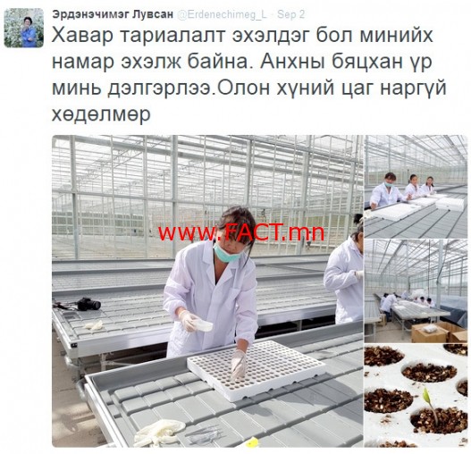 Ямартай ч УИХ-ын экс эмэгтэй гишүүд сонгуулиас хойш утсаа хааж, хаана юу хийж яваа нь мэдэгдэхгүй таг чиг болсон. Тэгвэл өнгөрсөн дөрвөн жилийн турш олны анхааралд явсан экс гишүүн Л.Эрдэнэчимэг улс төрөөс хол хөндий хувийн бизнестээ анхаарсан шиг завгүй ажиллаж яваа гэнэ. Юу хийж яваагаа тэрээр “Хавар тариалалт эхэлдэг бол минийх намар эхэлж байна. Анхны бяцхан үр минь дэлгэрлээ. Олон хүний цаг наргүй хөдөлмөр” хэмээн твиттер хуудастаа жиргэжээ.
