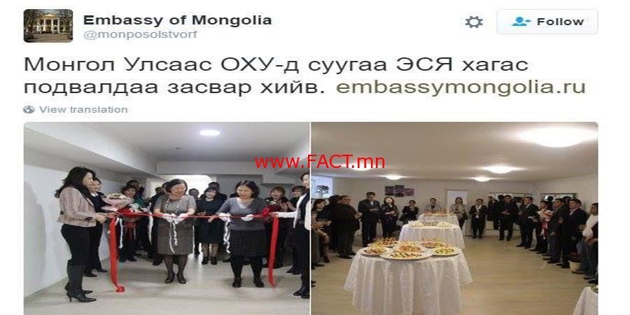 ОХУ-д Монгол Улсаас суух онц бөгөөд бүрэн эрхт Элчин сайд Б.Дэлгэрмаа ажлын байрандаа тохь тухтай орчинг бүрдүүлэх зорилгоор хагас подвалдаа иж бүрэн засвар хийжээ. Засварыг Москва хотод үйл ажиллагаа явуулдаг А.Сарангэрэл захиралтай “Интермедика” компани гүйцэтгэж, өнгөрсөн сарын 28-нд хүлээлгэн өгсөн байна.
