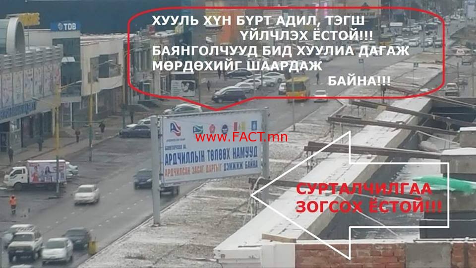 Сонгуулийн үеэр л иргэдээ санан дурсаж, ухаардаг улстөрийн шоу үргэлжилсээр… Өнөөдөр орон нутгийн сонгууль орон даяар болж байгаа үед шударга өрсөлдөхийг шаардсан хэсэг залуус Баянгол дүүргийн нутаг дэвсгэр дээр байгаа рекламны самбаруудын зургийг авч улстөрчдийг шударга байхыг сануулан “ШУДАРГА ЁСЫГ ТОГТООЖ , БҮЛЭГ ДЭЭРЭМЧДИЙГ ҮЛДЭН ХӨӨЦГӨӨЕ! ОДОО ХҮРТЭЛ САМБАРАА АВАХГҮЙ БАЙНА. Монгол улсын “Сонгуулийн тухай хууль”-ийн 68 дугаар зүйлийн 68.6 дахь хэсэгт “Сонгуулийн сурталчилгааг санал авах өдрөөс 24 цагийн өмнө буюу санал авах өдрийн өмнөх өдрийн 00:00 цагаас өмнө зогсооно” гэж заасан байдаг.” хэмээн өөрсдийн цахим хуудсандаа нийтэлжээ.