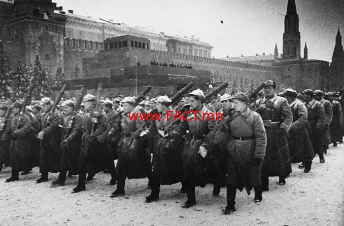1941 оны арваннэгдүгээр сарын 7-нд нацист Германы цэрэг Москвад тулж ирсэн эгзэгтэй үед тус улсын удирдагч И.Сталин Октябрийн хувьсгалын 24 жилийн ойн баярыг тэмдэглэх шийд гаргаж, Улаан талбайд цэргийн парад болжээ. Уг нь чухам энэ өдөр нацист Герман Москваг эзлэн Улаан талбайд өөрийн цэргийн сүрт жагсаал зохиохоор төлөвлөсөн байжээ.