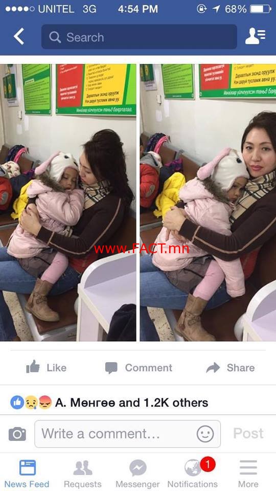 Тэрээр түргэн дуудахад ирж үзээд охиноо дүүрэгт үзүүл гэснээс эхлээд эмнэлэгээс эмнэлэг дамжиж явсаар эргээд дүүргийн эмнэлэгт ирсэн байна. Энэ хооронд охиноо эмчилж авах бус харин ч хүндрүүлж охины бие улам муудаж, хөл дээрээ ч зогсож чадахгүй болж айдас, түгшүүрт автаж явсан байна.