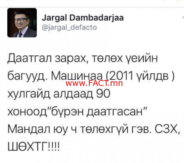 Defacto нэвтрүүлэг, улс төр эдийн засгийн нийтлэлүүдээрээ нийтэд танигдсан эдийн засагч Д.Жаргалсайхан сар орчмын өмнө “урт гартнуудад” машинаа алдсан аж. Үүнээс үүдэн автомашинаа даатгуулсан “Мандал даатгал” ХХК-тай өдгөө тэрбээр ширүүхэн маргаантай яваа гэнэ. Улмаар энэ тухай Д.Жаргалсайхан гуай тэсвэр алдаж өнөөдөр өөрийн твиттер хуудаснаа “Бүрэн хулгай, тал хулгайг даатгалынханаас өөр хэн мэдэх билээ. Бүрэн даатгал орсон гээд жил бүр хураамж авч байсан. Одоо юу ч өгөхгүй гэнэ” хэмээн бухимдангуй бичжээ. Түүний энэхүү жиргээг олон хүн дэмжиж, даатгалын компаниудын үүрэг хариуцлагын талаар ширүүхэн шүүмжлэл өрнүүлээд амжсан нь анхаарал татлаа.Г.Сар