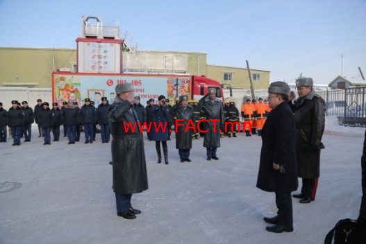 Төрийн тэргүүнийг сургалт, арга зүйн төвд хүрэлцэн ирэхэд Онцгой байдлын албаны бие бүрэлдэхүүн жагсч, хурандаа Н.Уламбаяр илтгэл өгч, ОБЕГ-ын дарга, бригадын генерал Т.Бадрал угтан авав.