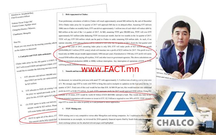 Гэхдээ Тавантолгойн 49 хувийг 400 сая ам.доллараар худалдах яриатай зэрэгцэн “Эрдэнэс-Тавантолгой” компанийн гүйцэтгэх захирал Д.Ариунболдод Хятадын “TTJV”-ээc нэгэн захидал хүргүүлсэн байх юм. “TTJV” нь анх Австралийн Макмахон компанийн охин компани байсан ч сүүлд Хятадын юомпанид хувьцаагаа худалдан шилжүүлсэн байдаг. Өдгөө “TTJV” нь “Эрдэнэс-Тавантолгой” компанийн гэрээт олборлогчоор ажилласныхаа хөлсөнд Тавантолгойн ордоос нүүрс авч хил давуулан зарж буй.