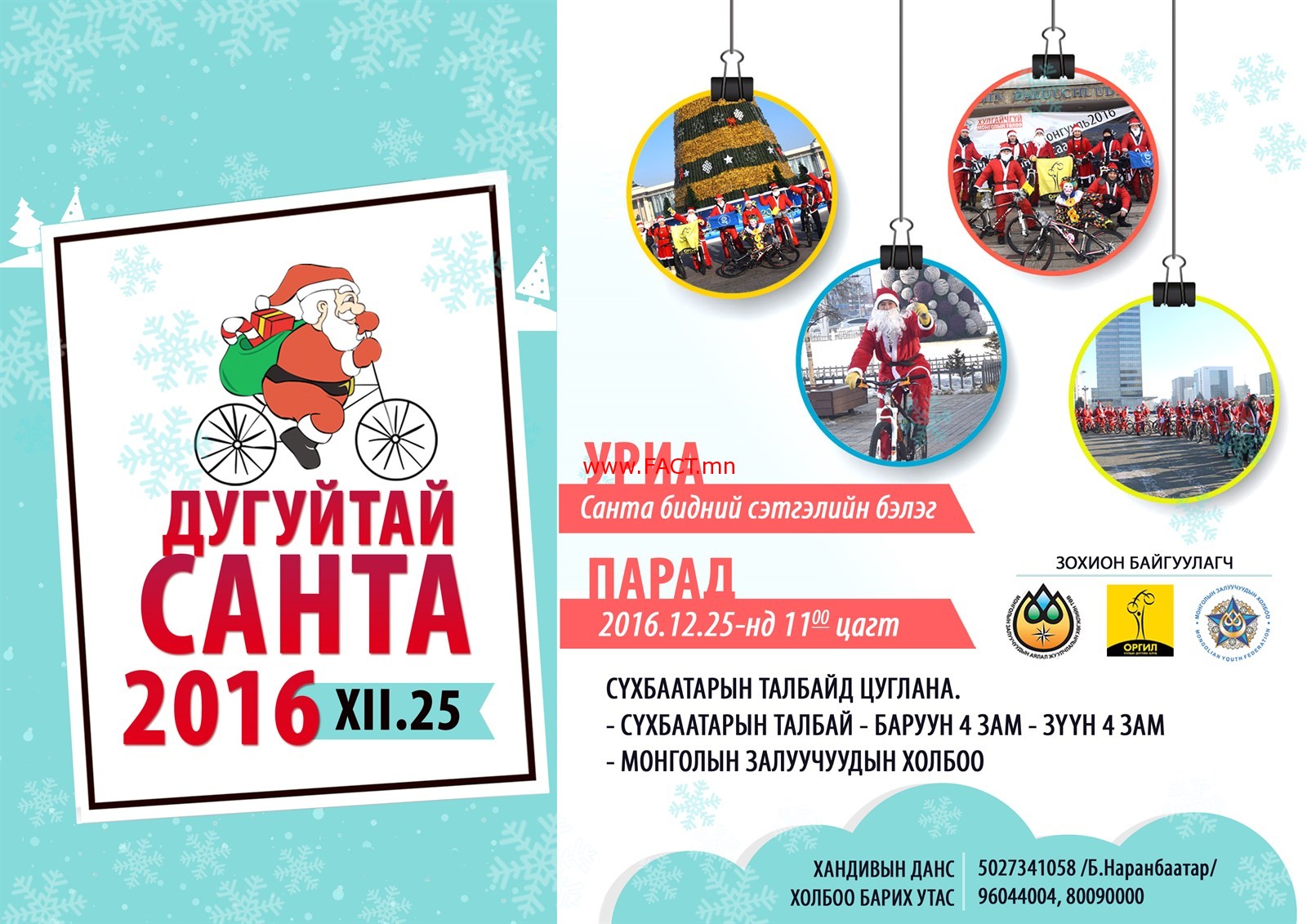 Монголын Залуучуудын Холбоо, МЗХ-ны дэргэдэх Залуучуудын Аялал Жуулчлалын Хөгжлийн Төв,“Оргил дугуйн клуб хамтран “ДУГУЙТАЙ САНТА-2016” сайн үйлсийн аяныг 12-р сарын 25 буюу ирэх Бямба гарагт 4 дэх жилдээ зохион байгуулах гэж байна.