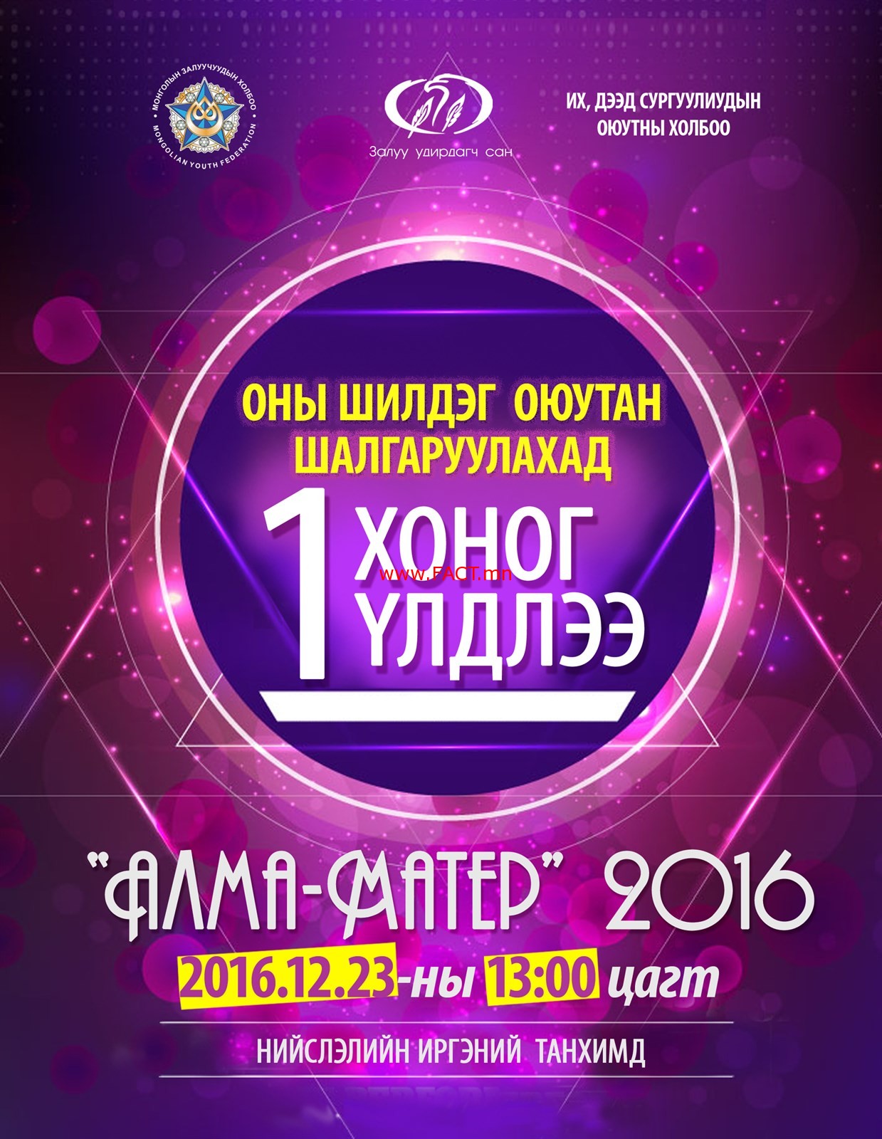 a2c74f52-3209-4799-90b0-30828cd122f0Монголын Залуучуудын Холбоо 1996 оноос эхлэн их дээд сургууль, коллежид суралцагч залуусын дунд оны шилдэг оюутнуудыг шалгаруулах “Алма матер” ёслолын ажиллагааг зохион байгуулдаг уламжлалтай билээ.