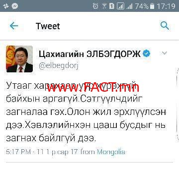 Тэрээр энэ үеэр “Нийслэлийн агаарын бохирдлыг бууруулах хуулийг би анх санаачилсан. Сэтгүүлчдийг нисдэг тэргээр авч явж утааг дээрээс нь харуулж байсан. Тийм ч учраас дэлхийд утаатай хамгийн сайн тэмцсэн Ерөнхийлөгчөөр намайг тодруулж шагнасан” гэх зэргээр олныг эгдүүцүүлж, алмайруулсан мэдэгдлүүдийг их хийлээ. Мөн үүний дараа Ерөнхийлөгч маань твиттер хуудсаараа дамжуулан “Утааг харахаар уур хүрэхгүй байх аргагүй. Сэтгүүлчдийг загналаа гэх. Олон жил эрхлүүлсэн дээ. Хэвлэлийнхэн цааш бусдыгаа загнах байлгүй” хэмээн мэдэгдсэн нь бас л цахим ертөнцийнхний гайхшралыг төрүүлээд байна.
