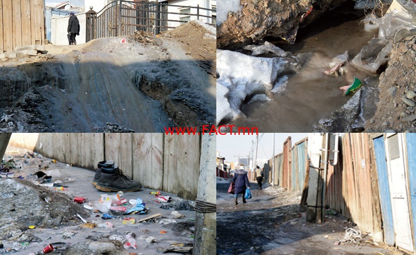 Зурагт үзүүлсэн энэ дүр зураг бол Гадангийн гудамжаас “Бөмбөгөр” худалдааны төв рүү чиглэсэн гудамжны төгсгөл хэсэг. Бөмбөгөр худалдааны төвийн баруун талын зам дагуу энэ хэсэг нүд хальтирмаар харагдана. Сааралтсан бохир ус асгасаар байгаад давхарлаж хөлдсөн, дээр нь бүр хоолны хаягдал, хог новш хөглөрөөстэй. Угаадастайгаа үнсээ холиод асгачихаж. Айлуудын хашааны завсраар нь урсч гарч ирсэн саарал хөлдүүс ч их байна. Бүр жалга руу өндөр дээрээс асгадаг цэгүүд ч нэлээд олон харагдана лээ. Ийм зүр зураг зөвхөн Гандан, “Бөмбөгөр” орчимд бус.