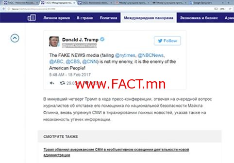 АНУ-ын Ерөнхийлөгч Дональд Трамп өөрийн албан ёсны твиттерт телевизийн NBC, ABC, CBS, CNN суваг болон “The New York Times” сонинг америкийн ард түмний дайсан хэмээн жиргэжээ. Хуурамч мэдээлэл тараадаг хэвлэл мэдээллийн хэрэгслүүд / The New York Times, NBC, ABC, CBS, CNN/ нь миний дайсан биш, америкийн ард түмний дайсан юм” хэмээн АНУ-ын тэргүүн бичсэн байна. Өнгөрсөн пүрэв гаригт болсон хэвлэлийн бага хурлын үеэр Трампаас сэтгүүлч үндэсний аюулгүй байдлын зөвлөх, шадар туслагч Майкл Пэлнийг нь огцрох тухай мэдээлэл тарсан тухай асуухад “хэвлэлийнхэн өөрийн олон уншигчид худал мэдээлэл цацах нь хууль бус үйлдэл гэдгийг сануулья” хэмээн хэлсэн гэнэ.