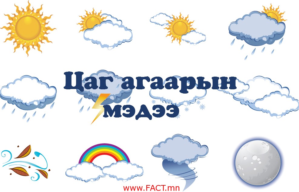 ТӨВИЙН АЙМГУУДЫН НУТГААР: Солигдмол үүлтэй. Цас орохгүй. Салхи баруун хойноос секундэд 5-10 метр. Дархадын хотгор, Ерөө голын хөндийгөөр шөнөдөө 23-28 градус, өдөртөө 9-14 градус, Хангай, Хөвсгөл, Орхон-Сэлэнгэ, Эг, Хараа, Туул, Тэрэлж голын хөндийгөөр шөнөдөө 18-23 градус, өдөртөө 4-9 градус, бусад нутгаар шөнөдөө 13-18 градус хүйтэн, өдөртөө 1 градус дулаанаас 4 градус хүйтэн байна.