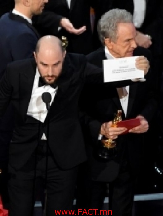 Тус компанийн тоо бүртгэгч Брайан Каллинан арга хэмжээний туршид “Twitter”-ээр тасралтгүй зураг илгээн жиргэж байсан гэв. Тийм ч учраас тэр Уоррен Битти ба Фэй Данауэй /ялагчдын нэрсийг зарлаж байсан жүжигчид/ нарт “Шилдэг кино” биш “Шилдэг эмэгтэй жүжигчин” шагналын ялагчийн нэртэй дугтуйг өгсөн байна. Уг дугтуйд “La La Land” киноны жүжигчин Эмма Стоуны нэр байсан тул Уоррен Битти, Фэй Данауэй нар тус мюзиклийг “Шилдэг кино” төрөлд ялагчаар андууран зарлажээ. Үнэн хэрэгтээ “Moonlight” кино энэ жилийн Оскарын наадмын “Шилдэг кино”-гоор шалгарсан юм.