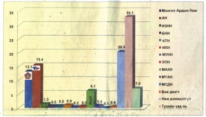 Энэхүү судалгааны хүрээлэнгийнхэн сая, есдүгээр сарын 16-30-ны хооронд нийслэлийн иргэдийн дунд уламжлалт, нарийвчилсан судалгаа явуулжээ. МАН-ын рейтинг ямар түвшинд байна гэж. МАН-ынхан маш сайн нууцалж чаддаг судалгааны энэ дүнгээ алдчихаж. Алдах алдах даа бүр Н.Энхбаярт алдчихаж. Н.Энхбаярт үнэнч цэргүүд энэ намын гурван гишүүн тутмын нэг нь байгаа болохоор алдалгүй яахав дээ. Энэ судалгаагаар МАН-ын рейтинг уначихжээ. Улаанбаатар хотод МАН-13 хувь, АН-15.4 хувь, МАХН-6.5 хувьтай гарсан байна. Энэхүү 13 хувийг 76 гишүүндээ хуваагаад үзэхээр улсын хэмжээнд МАН-ын 9 гишүүн л гарахаар байгаа юм. Улаанбаатараас бол нэг ч хүн гарахгүй нь тодорхой болжээ. Тус судалгааны дүнгээр бэлэн мөнгө амалсанд санал өгөхгүй, олон жил болсон намд санал өгөхгүй, олигархуудад санал өгөхгүй гэхчлэн гарсан байна. МАН-ынхан сүүлийн үед сүйд болоод бэлэн мөнгө тараахгүй, манай МАН бол шинэ, Ерөнхий сайдаа огцруулдагч юм бил үү… гэхчлэн гайхуулаад байсан нь ийм учиртай байж. Нууж байсан судалгааных нь дагуу л хийгдэж байсан ажил нь юм байна.