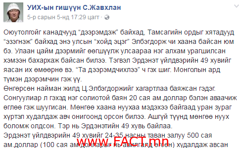 Тэгэхээр Ц.Элбэгдорж Эрдэнэтийн 49 хувиа “Дээрэмдүүлчихлээ” гэж УИХ-ын чуулган дээр хуурай агсам тавих нь зөв. Хөрөнгөө алдсан хүний уур бухимдал, тэвчээр алдалт тэндээс харагдаж байна лээ. Харин ард түмэн тэвчээртэй, хонь шиг учраас баялагаа цөлмүүлж байхдаа чимээгүй байсан. Ард түмний өмч албан тушаалтны өмч хоёр өөр юм.