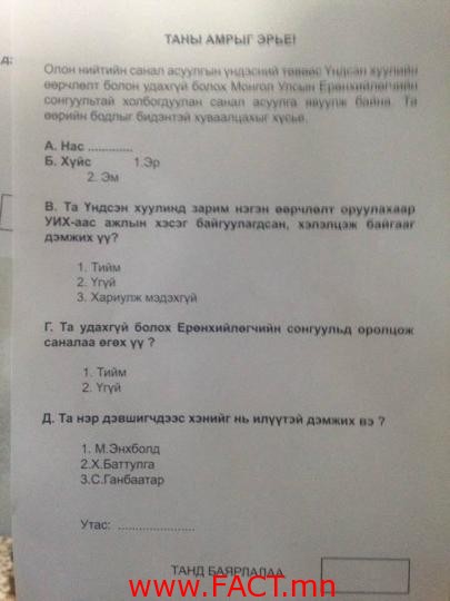Сонгуулийн сурталчилгаа албан ёсоор эхлэхээс өмнө нэр дэвшигчдийн чансаа тогтоосон элдэв төрлийн сурталчилгаа явуулах нь хуулиар хориотой ч энэ хууль хэрэгжихгүй байгааг эдгээр үйл явдал харуулж буй юм. Тэгвэл саяхнаас нийслэлийн айл өрхүүдээр нэр дэвшигчийн хэнийг нь дэмжих вэ гэсэн утгатай санал асуулга явж эхэлжээ. Энэ талаар нэгэн иргэн өөрийн нүүр номондоо бичсэн байсан юм. Үндсэн хуульд өөрчлөлт оруулахыг дэмжиж байгаа эсэх болон нэр дэвшигчдээс хэнийг нь дэмжиж буйг асуусан санал асуулгын хуудсыг ч мөн оруулсан байлаа.