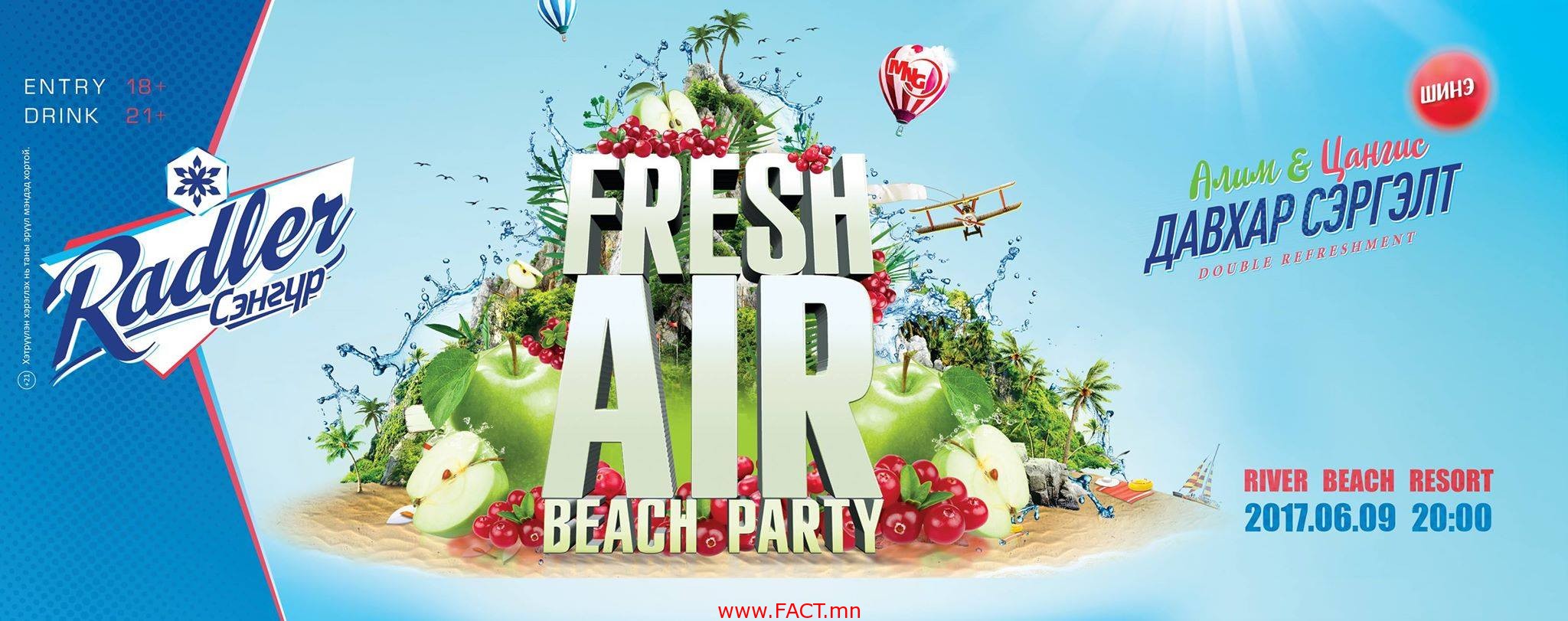 Ⓐ Эрхэм залуусаа MNG EVENT™-с жилийн жилд зуны нээлтийн ЗАДГАЙ GRAND OPENING DJ PARTY-г эрч хүчтэй & чанартайгаар зохион байгуулсаар дариу 4 жил болжээ. FRESH AIR™ 2017 DJ PARTY нь зуны эхэн сард хотын төвөөс ердөө 6км зайнд орших RIVER BEACH RESORT-д 6 сарын 9 нд 20:00 цагаас Алим & ЦАНГИС жимсний цоо шинэ амттай RADLER шар айрагтай хамтран НҮСЭР Тайз болон Гэрэл, Хөгжмийн нүргээн доор зохион байгууллах гэж байгааг дуулгахад таатай байна.