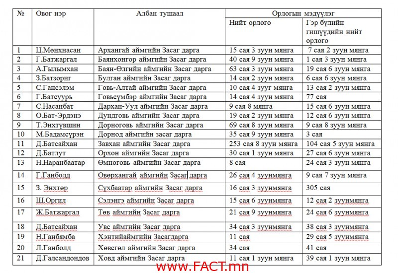АТГ-аас албан тушаалтнуудын хөрөнгө орлогын мэдүүлгийг олон нийтэд танилцуулсан билээ. Аймгуудын Засаг дарга нарын хөрөнгө орлогын мэдээллийг ийнхүү хүргэж байна.