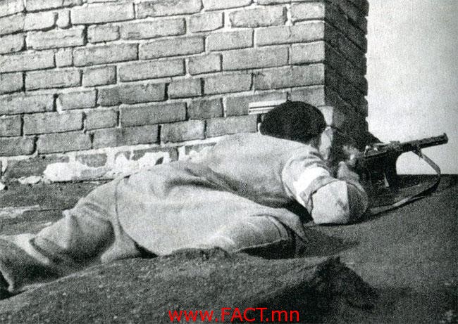 Түүний шууг хуга буджээ. Намайг оночихлоо доо гэж тэрхэн агшинд бодоод хойш сууж нуугдаад дээврийн хашлага дагуу мөлхлөө. Шархдсан баруун гараас нь цус урсаж, хамаг хувцсыг нь будна. Гэхдээ зүгээр л тасдаад авчихсан мэт ямар ч өвчин үл мэдрэгдэнэ. Халааснаасаа тонгорог гаргаж, ханцуйгаа тасдаад харвал сум нэвт гаралгүй ясанд нь тээглээд тогтжээ. Гадуур хувцасаа тайчин хаяад жижиг цүнхнээс шилэн савтай йодын уусмал гаргаж шархаа цэвэрлэв. Одоо л мэдээ орж байгаа бололтой, янгинаж эхэллээ. Нэгэнт хэрэггүй болсон ханцуйгаа цуу татан шархан дээрээ тавьж сайтар боогоод шүдээрээ татаж чангаллаа. Ямартай ч цус алдаж үхэхээргүй боллоо. Боож дуусаад зовиуртайгаар дээшээ харж хэвтэв.