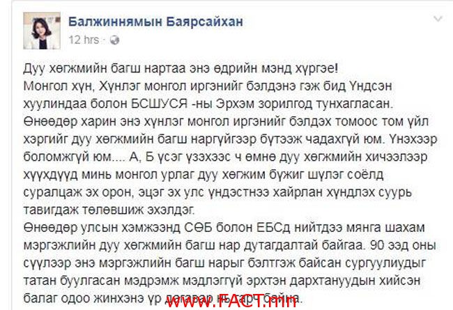 Боловсрол, соёл, шинжлэх ухаан, спортын яамны Төрийн нарийн бичгийн даргаар ажиллаж байгаад саяхан ажлаас чөлөөлөгдсөн Б.Баярсайхан цахим хуудсандаа дунд боловсролын талаар хөнджээ. Тэрээр тус яаманд ТНБД-аар арав гаруй сар ажиллахдаа хийсэн зарим ажлаа дурьджээ.