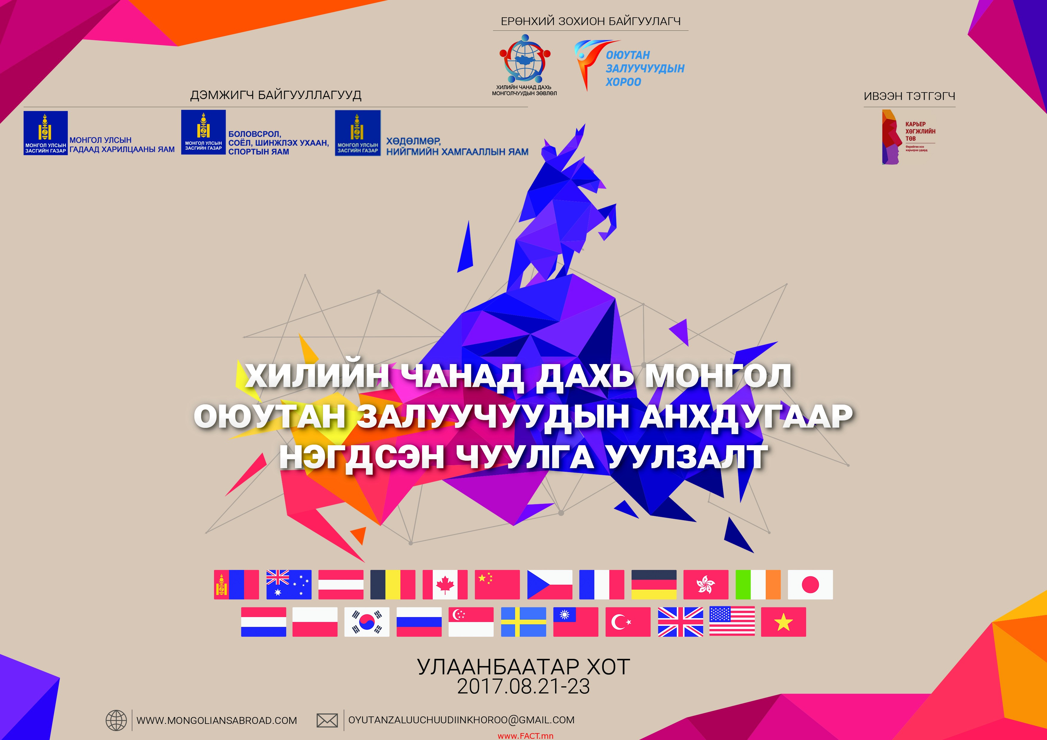 Хилийн чанадад суралцаж байгаа 40.000 монгол оюутан залуусын төлөөлөл 8-р сарын 21-23-ны хооронд Улаанбаатар хотод анх удаа чуулан “Хилийн чанадад оршин сууж байгаа монгол залуусын эх орондоо суурьших боломж, нөхцөл” сэдвийн хүрээнд хилийн чанадад суурьшиж буй иргэдийн нэгдсэн мэдээллийн санг үүсгэх асуудлаар хэлэлцэнэ.