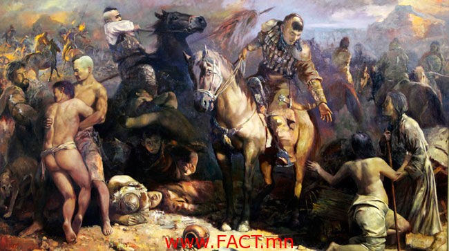 Зургийг анхааралтай хараарай. Сонгодог зураг гэж хэлж болно доо. “Монголын нууц товчоо”-нд гардгаар Тэмүүжин өөрийн хайртай хатан Бөртэг Мэргэдээс булааж авах тэр агшныг зургаас уншиж болох юм. Дунд нь байгаа морьтой, баатрын хувцастай хүн бол Тэмүүжин. Тэр цээж нүцгэн бие давхар эмэгтэй рүү авралын гар сунгаж байна. Тэр хайртай хатан нь. Бөртэгийн гараас дэмнэн байгаа таягтай эмэгтэй бол Хуагчин эмгэн аж. Бас Тэмүүжингийн хажууд тулан ирээд мориныхоо амыг хатайртал татаж байгаа дайчин эр байна. Тэрээр юу хэлж байгааг зураачийн тайлбараас үзвэл Тэмүүжин тэр цагаас эхлээд бүхний хүндэтгэл, итгэлийг хүлээсэн их хаан болох зам нь эхэлсэн гэсэн санаа юм байна. Тэмүүжин тэр цаг мөчөөс өмнө бусдаас нуугдсан байдалтай байсан бөгөөд Бөртэд хязгааргүй хайртайн учир энэхүү тулаанд амь хайргүйгээр орж ялалт байгуулж байгаа нь ажээ.