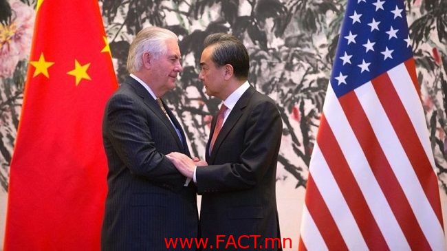 АНУ-ын Төрийн нарийн бичгийн дарга Рекс Тиллерсон Бээжин хотод албан айлчлал хийлээ. Тэрбээр Хятад улсын дарга Си Жиньпинтэй Ардын их хурлын ордонд өнгөрсөн сарын 30-нд уулзсан байна. Энэ үеэр Си Жиньпин “Хятад АНУ-ын харилцаа тогтвортой хөгжиж байна. Хоёр талын ажлын хэсэг Төрийн тэргүүн нарын нийтлэг ойлголтын дагуу, хоёр орны харилцааны чиг хандлагыг баримталж, харилцан хүндэтгэсэн, ашигтай, хөнгөлөлттэй, хамтран ажиллаж, санал зөрөлдөөнөө эвтэй зохицуулан, хоёр орны харилцааны тогтвортой хөгжлийг ахиулах ёстой. Цагаан ордны тэргүүний Хятадад ирэх сард хийх төрийн айлчлалыг манай улс ач холбогдол өгч дээд хэмжээнд бэлтгэж байна” хэмээв. Мөн “Хоёр тал, бүс нутаг, олон улсын хэмжээнд хамтран ажиллах шаардлагатай олон төсөл бий. Харилцан ашигтай хамтын ажиллагааг өрнүүлж, олон улсын болон бүс нутгийн сэдвээр хамтын ажиллагааны шинэ өсөлтийг бэхжүүлэх шаардлагатай” гэж Хятад улсын дарга онцолжээ. Харин Р.Тиллерсон АНУ-ын Ерөнхийлөгч Д.Трампын Си Жиньпинд хүргүүлсэн мэндчилгээг уламжлаад, Цагаан ордны тэргүүний Хятадад хийх төрийн айлчлалын бэлтгэл ажлын талаар санал солилцсон байна. “Хятад улстай харилцаагаа хөгжүүлэхийг Вашингтоны тал чухалчилдаг. Талууд харилцан итгэлцлээ нэмэгдүүлж, дипломат харилцаагаа эрчимжүүлэн, олон салбарын ажил хэрэгч хамтын ажиллагааг гүнзгийрүүлэх шаардлагатай. Мөн олон улсын болон бүс нутагт тулгарч буй сорилтуудыг хамтдаа даван туулахад бэлэн байна” гэж Рекс Тиллерсон онцоллоо. АНУ- ын Төрийн нарийн бичгийн даргын Бээжинд хийсэн айлчлалын талаар шинжээчид өөрсдийн байр сууриа илэрхийлсэн байна. Тухайлбал, “Карнеги” сангийн Азийн салбар хариуцсан захирал Дуглас Паал “Хятадын Умард Солонгост үзүүлэх нөлөөг сулруулах зорилгоор Вашингтоны тал Төрийн нарийн бичгийн даргаа илгээлээ. Хятад улс Умард Солонгост худалдааны хориг тавибал Пхеньяны орлогын эх үүсвэр тасалдана. АНУ-ын Төрийн Департаментын мэдээлснээр Умард Солонгос 2016 онд Хятадаар дамжуулж 1.5 тэрбум ам.долларын бараа эргэлт хийжээ. Умардын тал Хятадын байр суурийг хүлээн авдаг. Тиймээс Хятадын удирдагчийг ятгаж чадвал АНУ зорилгодоо хүрэхэд нэг шат ахина” хэмээн дүгнэжээ. АНУ-ын Ерөнхийлөгч Дональд Трамп Хятадын төрийн тэргүүнийг “Хятадын сүүлийн 100 жилд төрсөн хамгийн хүчирхэг удирдагч. Бид нягт хэлхээ холбоотой ажиллаж байгаа” хэмээв. “Вашингтон пост” сонинд мэдээлснээр, Д.Трамп Хятад, АНУ-ын хүмүүнлэгийн хамтын ажиллагааны оройн зоогт оролцохдоо ийнхүү хэлжээ. АНУ-ын Ерөнхийлөгчийн үгийг Оросын агентлагууд эш татаж байна. Тухайлбал, “Вашингтон Умард Солонгосыг дарахын тулд Бээжингийн эрх баригчдыг ятгаж эхэлсэн. Д.Трампын үг Си Жиньпинд тал зассан хандлагатай нь илэрхий байна. НҮБ- аас Умард Солонгосын эсрэг тавьсан хориг арга хэмжээг хэрэгжүүлэхийн тулд БНХАУ-ын эрх баригчид тус улсад үйл ажиллагаа явуулж буй Умард Солонгосын компаниудыг хаах шийдвэр гаргасан. Эдгээр компанийг 2018 оны нэгдүгээр сард бүрэн татан буулгахаар тохиролцжээ. Хятад, Умард Солонгосын хамтарсан компаниудад ч энэ хууль үйлчлэх аж” хэмээн ТАСС агентлаг мэдээллээ.