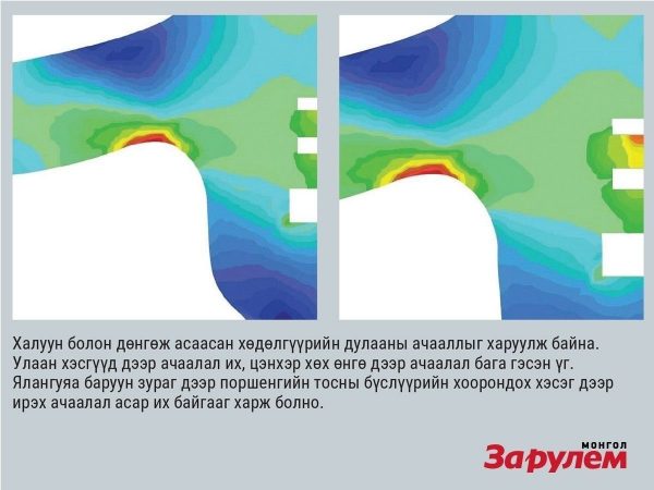 Ийм их температурын нөлөөнд поршенгийн тосны бүсний хоорондох хэсэг хамгийн их өртдөг. Дулааны асар их ачаалал ирэхийн сацуу поршенгийн бүсний үрэлтийн хүч эрс нэмэгдсэнээр бүс хоорондох хэсэг ачааллыг даадаггүй. Цилиндрийн клапангийн шилбэний ховил яг ийм шалтгаанаар хүйтэн асаалтыг тэсдэггүй.