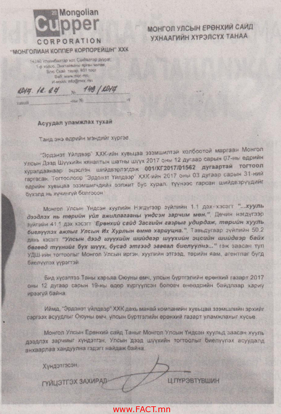 Улсын Дээд шүүхийн шийдвэрийг Оюуны өмч, улсын бүртгэлийн ерөнхий газар болон Төрийн өмчийн бодлого зохицуулалтын газар уландаа гишгэж өдий болтол шүүхийн шийдвэрийг биелүүлэхгүй байгаа тул ийнхүү Монгол Улсын Ерөнхий сайдад уламжиллаа. Учир нь Үндсэн хуулийн Нэгдүгээр зүйлийн 1.1 дэх хэсэгт “.. хууль дээдлэх нь төрийн үйл ажиллагааны үндсэн зарчим мөн”, Дөчиннэгдүгээр зүйлийн 41.1 дэх хэсэгт “Ерөнхий сайд Засгийн газрыг удирдаж, төрийн хууль биелүүлэх ажлыг УИХ-ын өмнө хариуцна.” гэж заасан байдаг. Мөн Тавьдугаар зүйлийн 50.2 дахь хэсэгт “Улсын Дээд шүүхийн эцсийн шийдвэр байх бөгөөд түүнийг бүх шүүх бусад этгээд заавал биелүүлнэ…” гэж заасан байдаг тул яам, агентлагууд шийдвэрийг биелүүлэх ёстой юм. Гэвч том толгойлсон агентлагийн удирдлагууд үүргээ умартаж, заавал Ерөнхий сайдыг лүндэн буулгасны дараа хөдлөхөөр шийдсэн бололтой. “Монголын зэс” корпораци нь төрдөө нухлуулдаг хувийн хэвшлийнхний эрх ашгийг хамгаалах бамбай болж яваа билээ. Тиймээс Монгол Улсын Ерөнхий сайд Үндсэн хуулиа дээдэлж, шүүхийн тогтоолыг биелүүлэх асуудалд анхаарлаа хандуулах хэрэггэй байна.