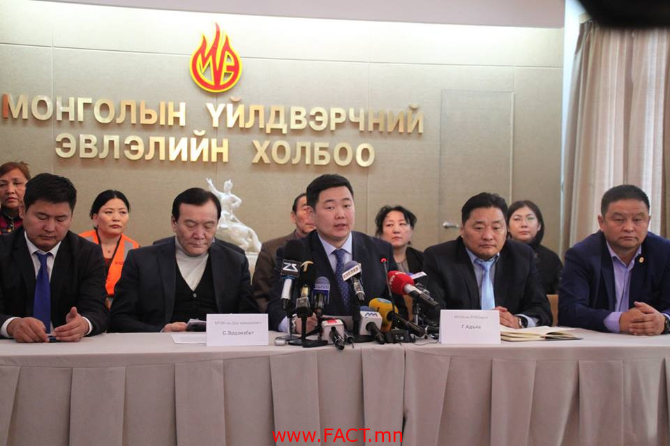 МҮЭ-ийн холбооноос Хөдөлмөр, нийгмийн зөвшлийн гурван талт 2017-2018 оны Улсын хэлэлцээрийн хэрэгжилт, тэтгэвэрийн нас, татвар нэмэгдүүлсэн асуудлаар МҮЭ-ийн холбооны дэд ерөнхийлөгч С.Эрдэнэбат, МҮЭ-ийн холбооны ЕНБД Г.Адъяа, салбарын үйлдвэрчний эвлэлийн холбоодын дарга нар өнөөдөр мэдээлэл хийлээ.