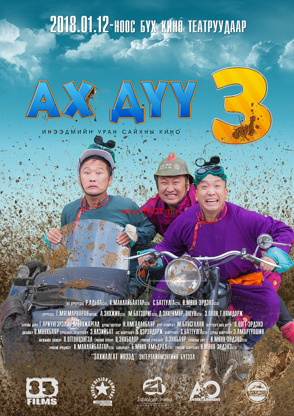 90 минут үргэлжлэх бүрэн хэмжээний “Ах дүү гурав” уран сайхны киноны зохиолыг бичиж найруулсан Ө.Мөнх-Эрдэнэ, продюсер Х.Манлайбаатар, 2-р найруулагч С.Баттулга, гол дүр болох ах дүү гуравт Захиалгат Инээд хамтлагийн Мөөжиг, Манлай, Адъяа. Аавын дүрд АЖ Г. Мягмарнаран тоглож, жүжигчин О.Оюун, Х-ТҮЦ-ийн Онон, Шинэ үеийн Энхжин, Приүсийн босс киноны Батзориг, Нямдорж гэх мэтчилэн олон танил жүжигчид тоглосон байна.