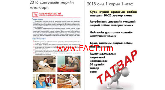 Гэтэл МАН өнгөрсөн сонгуулиар “…Татвар нэмэхгүй. Шинээр татвар бий болгохгүй” гэж амлаж гарч ирсэн. Магадгүй, МАН-ыг сонгосон хамгийн том шалтгаан нь энэ байх.