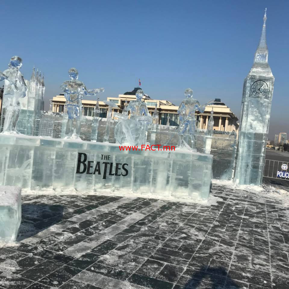 Тэр мөсөн гоёлыг урласан залуус өнөөдөр Сүхбаатарын талбайн автомашины зогсоолын зүүн хойно Английн Элчин сайдын яамны захиалгаар английн алдарт Битлз хамтлагийн дөрвөл болон английн хатан хааны ордныг гоёмсгоор урлаад дуусч байхтай таарлаа.