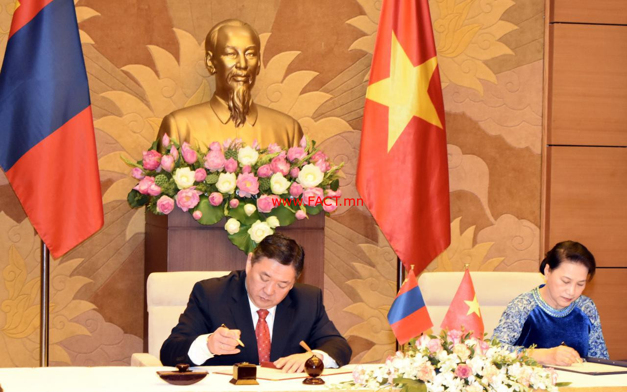 Улсын Их Хурлын дарга М.Энхболд “Миний бие Ханой хотноо болсон Ази, Номхон далайн орнуудын парламентын 26-р хуралдаанд оролцож, Үндэсний ассамблейн дарга, хатагтай Нгуен Тхи Ким Нгангийн урилгаар БНСВУ-д албан ёсны айлчлал хийлээ. Айлчлалын үеэр албан ёсны хэлэлцээ хийж, хоёр орны хууль тогтоох байгууллага хоорондын хамтын ажиллагааны Санамж бичигт гарын үсэг зурсан. 1950-иад оны дунд үеэс манай нам, төрийн тэргүүн нарын үндэс суурийг нь тавьсан харилцаа, хамтын ажиллагаа 60 гаруй жилийн түүхэн хугацааг туулж, амжилттай хөгжиж байна. Бид Вьетнам орныг манай Зүүн өмнөд Ази дахь гол түнш орноо гэж үздэг” хэмээн онцоллоо.