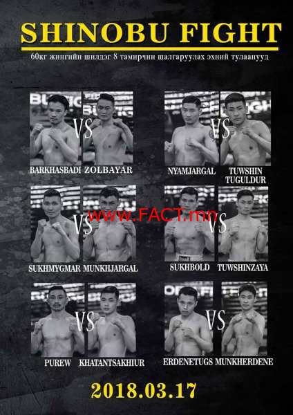 Шинобу файт 2018 мэргэжлийн кикбоксын шилдгийн шилдгийг шалгаруулдаг тулаан 60кг жинд анх удаа зохион байгуулагдах гэж байна. Тус тулаанд шилдэг 18 тамирчин хурд хүч авхаалж самбаагаа сорин өрсөлдөх бөгөөд шалгарсан аваргыг 10.000.000₮ -р шагнадагаараа Монголын хамгийн өндөр шагналын сантай шилдэг тулаанчид оролцдог тэмцээн юм. Тус тулаанууд нийтдээ 1 сар гаран үргэлжлэх бөгөөд гуравдугаар сарын 17 нд эхний 10 тамирчин, 24-нд үлдсэн тамирчид нь тулалдах юм. Энэ тулаануудаас шилдэг 8 тамирчин шалгарч үлдэх бөгөөд шилдэг 4 г шалгаруулах халз тулаанууд дөрөвдүгээр сарын 7 нд болох бол 10 саяын эзэн аваргыг шалгаруулах сүүлийн тулаанууд 14 өдөр болох болно. Энэхүү халз тулаанууд зүүн 4 замын хажууханд байдаг Somang plaza SF clubt 19:00 цагт эхлэнэ. Тасалбарын үнэ: 10.000₮ бөгөөд хүний тоо хязгаартай. Энэхүү тэмцээний мэдээллийн ивээн тэтгэгчээр Монголын үндэсний сайтын хөгжлийн нэгдсэн холбоо хамтран ажиллаж байна.