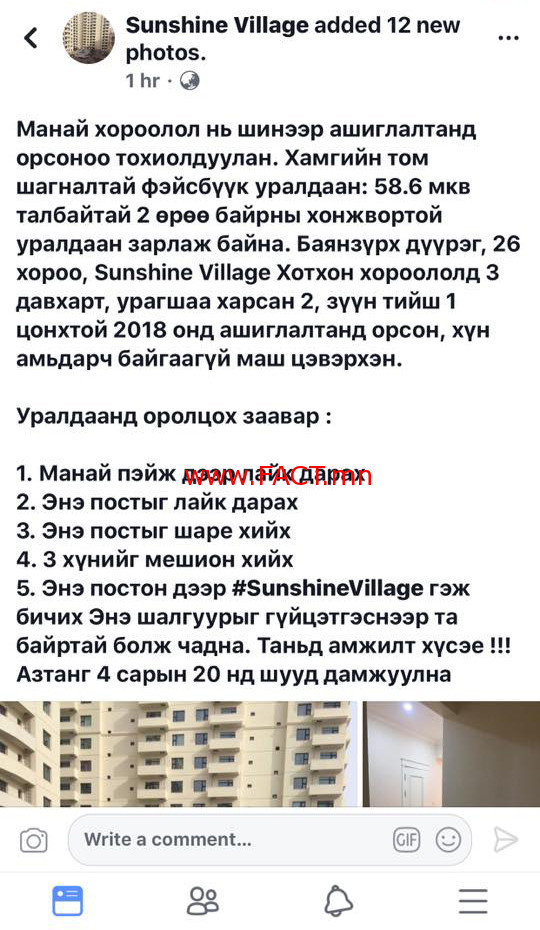 “Манай хороолол нь шинээр ашиглалтанд орсноо тохиолдуулан. Хамгийн том шагналтай фэйсбүүк уралдааныг зарлаж байна. 58.6 мкв талбайтай 2 өрөө байрны хонжвортой уралдаан зарлаж байна. Баянзүрх дүүрэг, 26 хороо, Sunshine Village Хотхон хороололд 3 давхарт, урагшаа харсан 2, зүүн тийш 1 цонхтой 2018 онд ашиглалтанд орсон, хүн амьдарч байгаагүй маш цэвэрхэн.