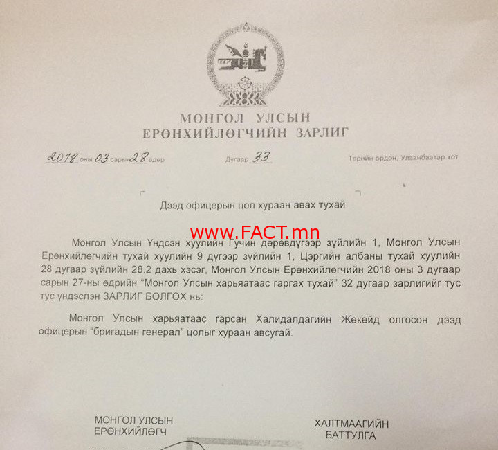 Монгол Улсын харьяатаас гарсан Халидалдагийн Жекейд олгосон дээд офицерын “бригадын генерал” цолыг хураан авсугай” гэжээ.